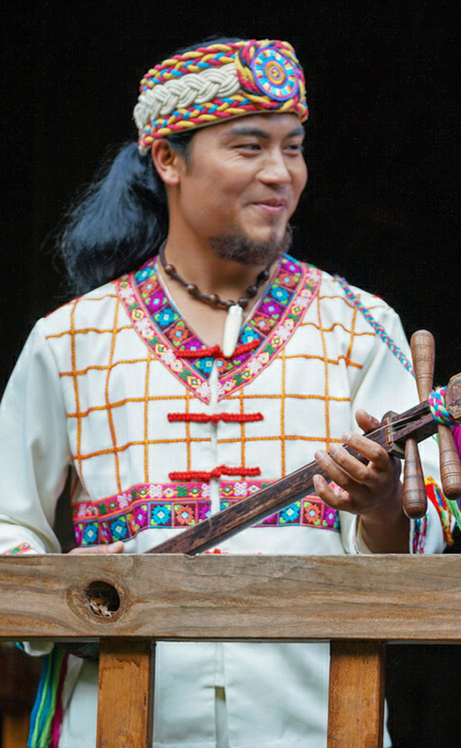 佤族人口約36萬,主要聚居在云南省瀾滄江南段以西的阿佤山區。佤族寨位于“翠漪洲”東南角。寨內分布有茅草頂的干欄式建筑群、牛頭廣場、神靈廣場、司崗里石雕以及糧倉等。牛頭廣場是佤族古老的剽?;顒訄鏊瑘稣械呐=菫樨糇宓恼瘶?,廣場前的兩個石人分別為佤族的男性和女性祖先。神靈廣場表現了佤族萬物有靈、靈魂不死的自然崇拜觀念。場中兩個石人雕像分別為佤族最崇拜的“木依吉”和“阿依娥”。佤族木鼓舞節拍鮮明強烈,...